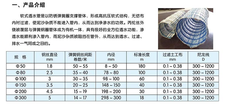 透水管是以防銹彈簧圈支撐管體,形成高抗壓軟式結(jié)構(gòu),無紡布內(nèi)襯過濾,使泥砂雜質(zhì)不能進(jìn)入管內(nèi),從而達(dá)到凈滲水的功能。滌綸絲外繞祉覆層具有優(yōu)良吸水性,能迅速收集土體中多余水份。橡膠筋使管壁被覆層與彈簧鋼圈管體成為有機(jī)一體,具有很好的透水功能,滲透水順利滲入管內(nèi),而泥砂雜質(zhì)被阻擋在管外,從而達(dá)到透水、過濾、排水一氣呵成之目的。